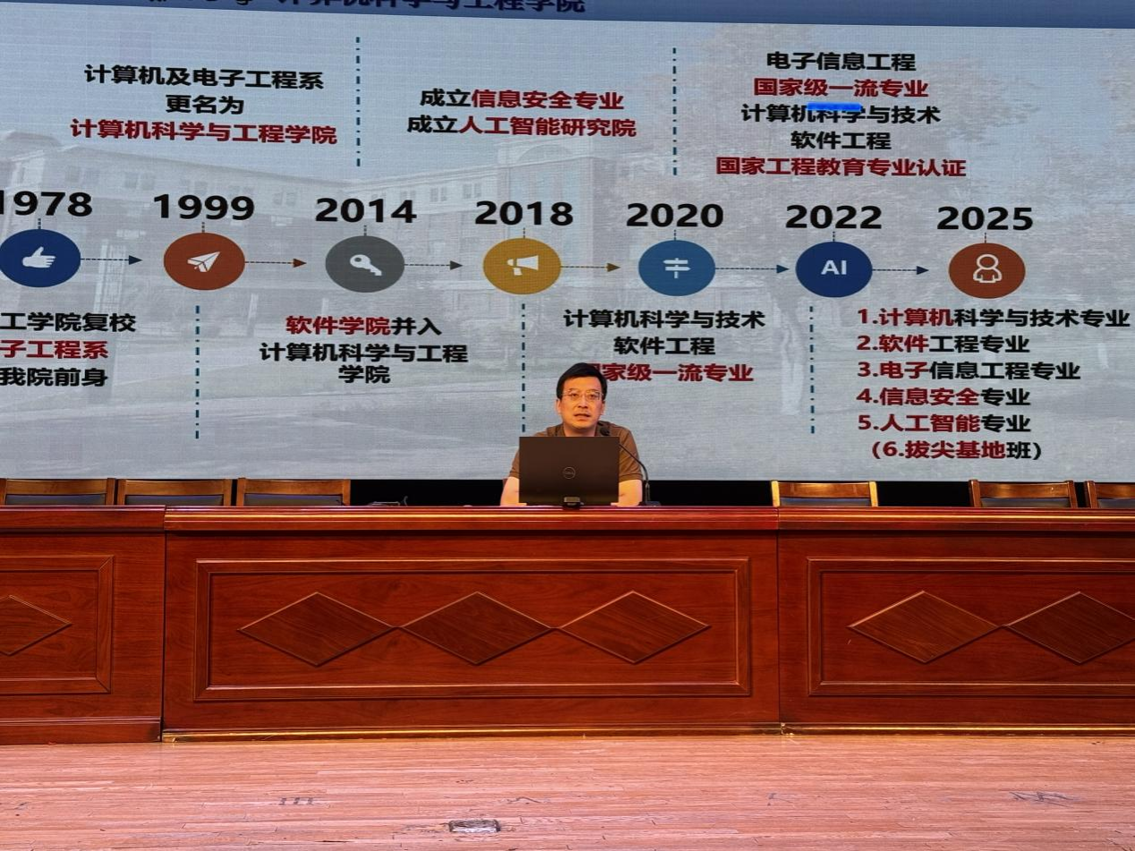 随后,程超院长以“校史校训传承、学院发展历程、专业建设与学科特色”为主线,为新生带来一场内容丰富、视野开阔的专题讲座。他结合当前人工智能、大数据等前沿科技发展趋势,系统阐述了计算机相关专业的广阔前景与发展机遇,并围绕大学期间如何有效平衡学习与生活、提升自我管理与学术素养、科学进行职业规划等实际问题,提出了务实而中肯的建议,助力新生从容启航、稳健前行。